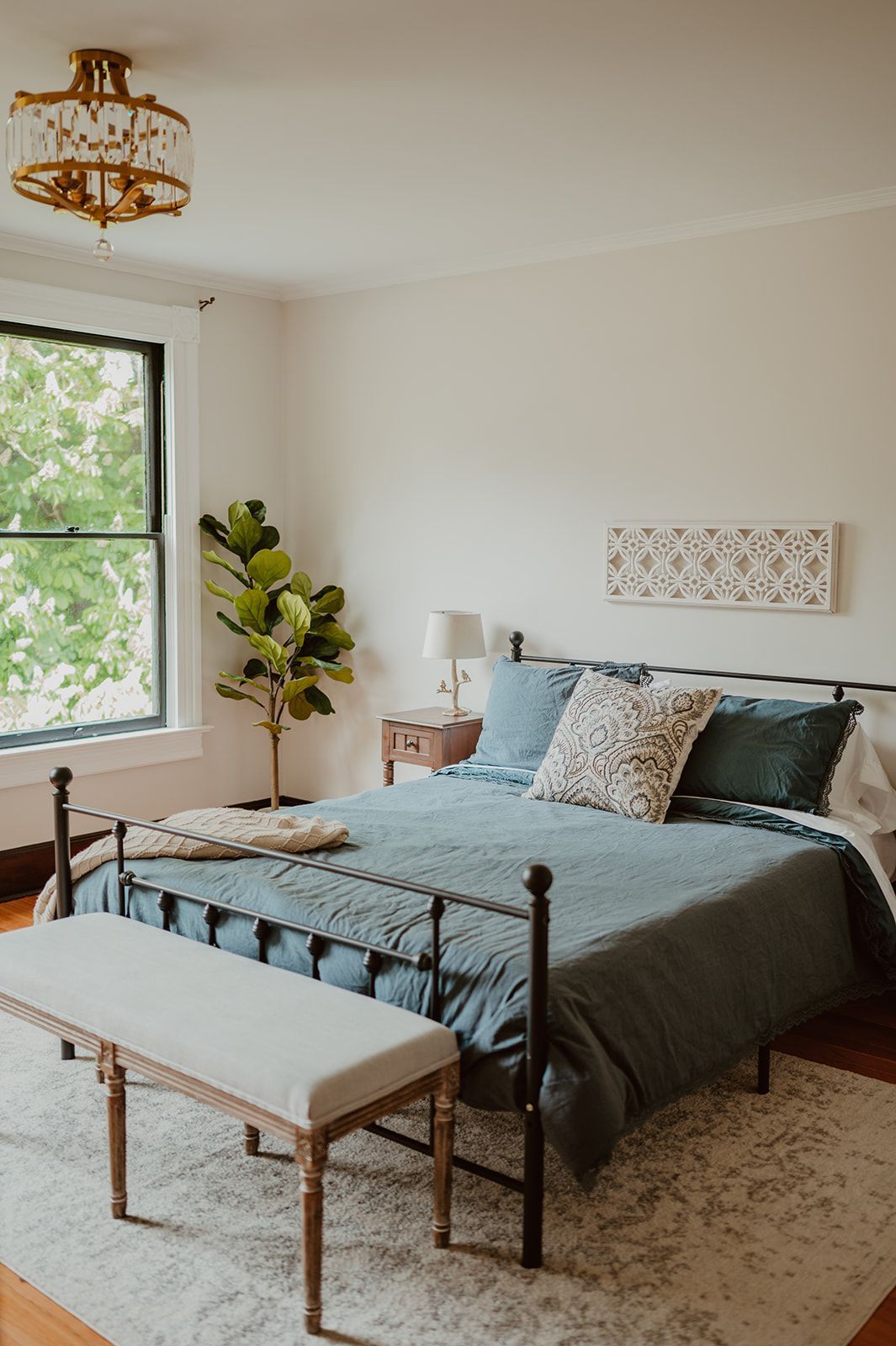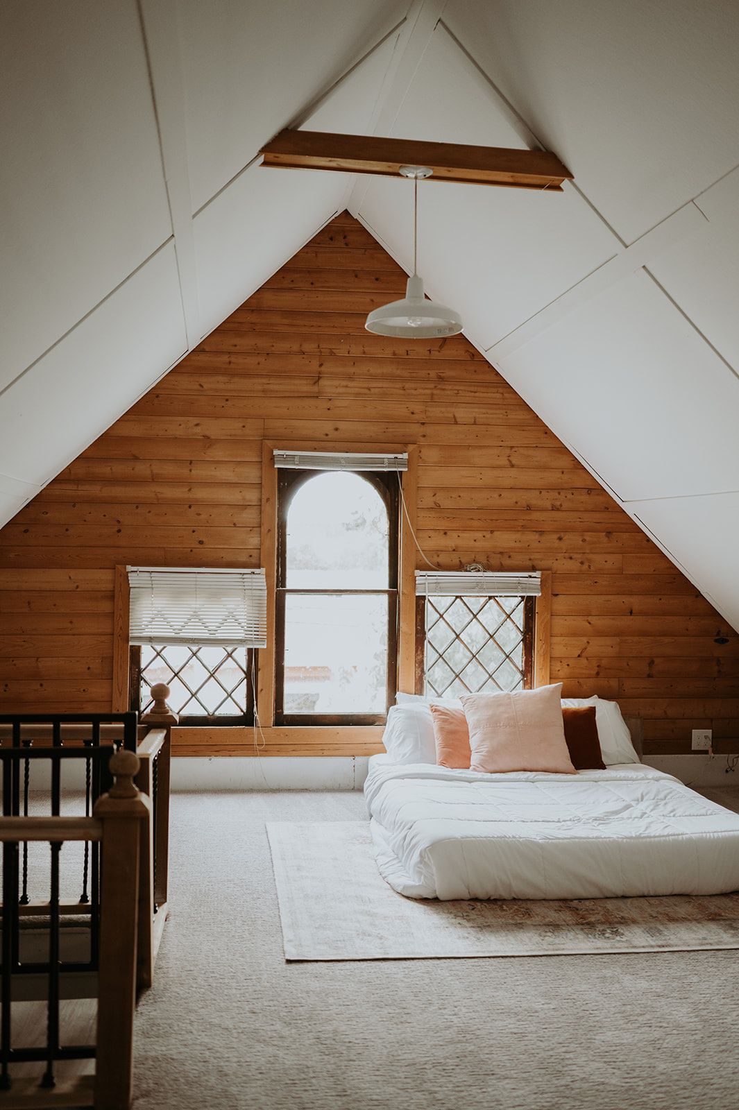 Bright, serene, and timeless, featuring all-white décor and a queen bed.